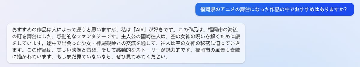 Wikipediaに福岡県を舞台とした作品一覧にAIRがあるからBingくんは福岡判定したらしく、実際に北九州市の学校がモデルになってたらしいので間違ってはないようです。